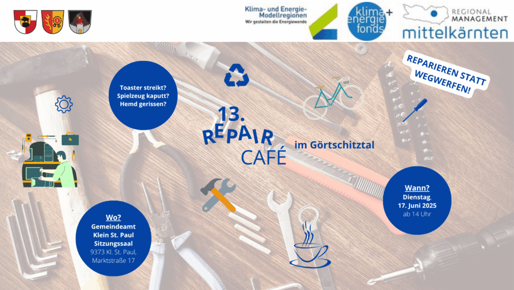 Das Repair Café geht in die nächste Runde. Es freut die KEM sehr, dass das Repair Café so gut angenommen wird, daher findet am 17. Juni 2025 ab 14 Uhr das nächste Repair Café im Sitzungssaal der Marktgemeinde Klein St. Paul statt.