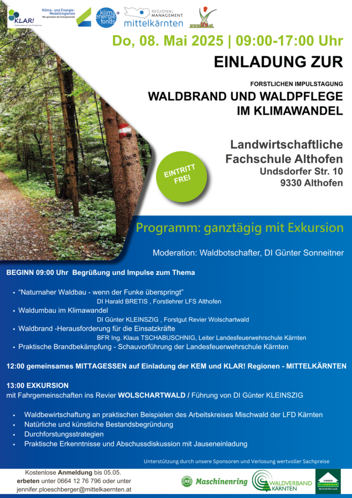 Die Klima- und Energie-Modellregionen (KEM) und die Klimawandelanpassungsregionen (KLAR!) der Region Mittelkärnten veranstalten am 08. Mai 2025 eine Impulstagung zum Thema „Waldbrand und Waldpflege im Klimawandel“.